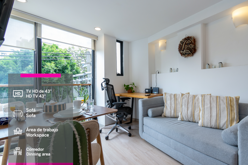 Área de trabajo + WiFi 60mbps + Roof garden común+ Vigilancia 24hrs + Early check-in/late check out + Limpieza semanal.